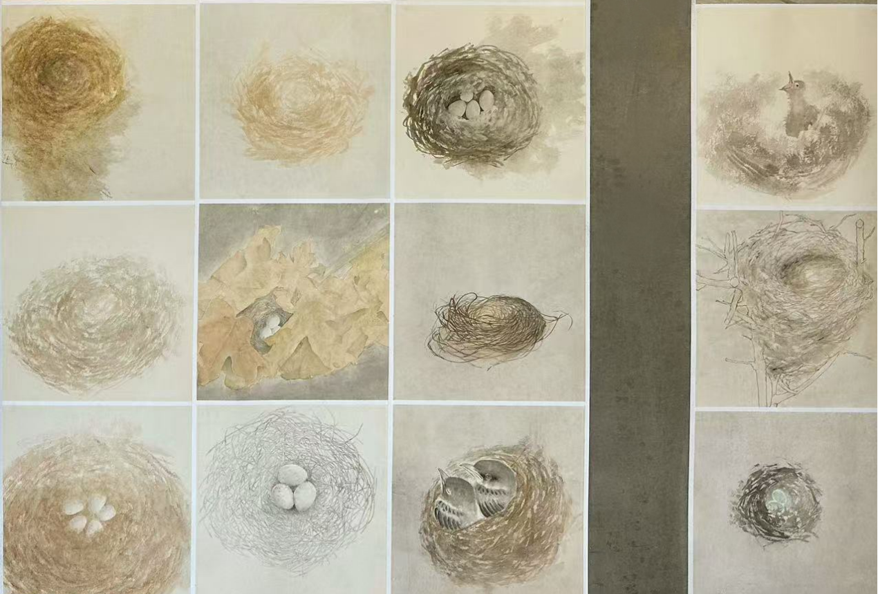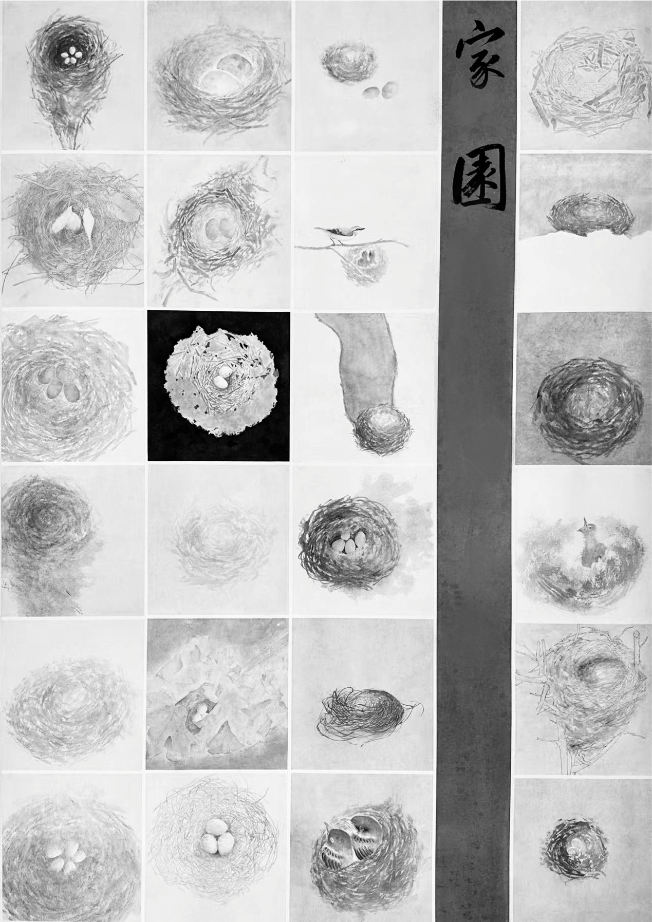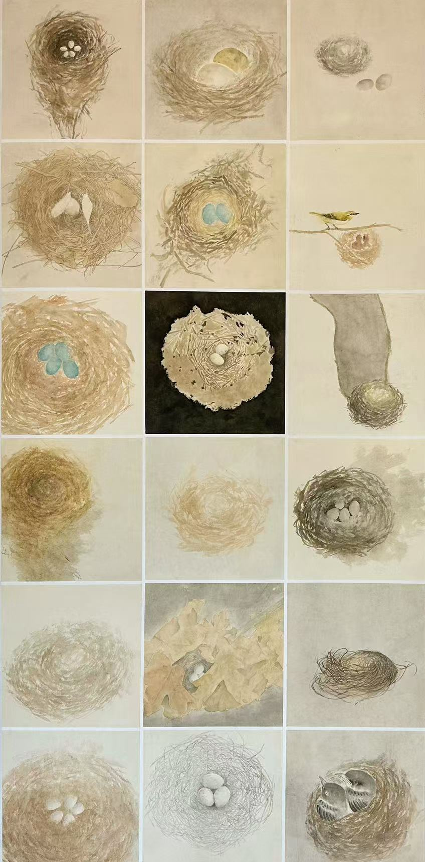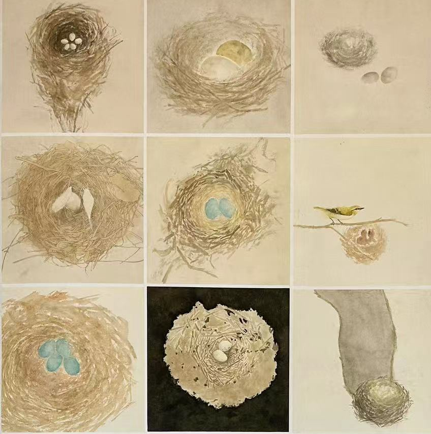 设计说明:该国画作品通过把多张鸟巢的绘画拼接起来强烈的突出了“家园”的主题,色调采用大地色系(枯枝黄、泥土棕),强化返璞归真的自然属性。同时巢穴的悬空感与结构稳定性形成视觉张力,警示生态平衡的微妙:一如鸟巢倾覆则雏鸟无依,自然崩坏则家园不存,传递“人类家园亦如自然生灵栖居之所”的哲思,以鸟巢的天然构造隐喻人类家园,诠释生态平衡的永恒命题。